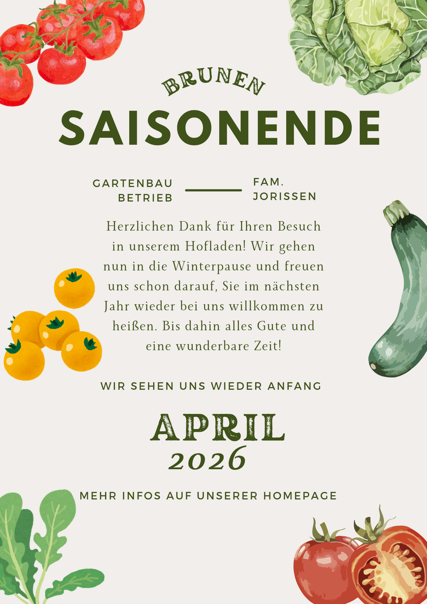 Wir möchten uns auch in diesem Jahr wieder herzlich bei unseren Kunden und Geschäftspartnern für die gute Zusammenarbeit, das Vertrauen und die Treue bedanken. Der Verkauf 2026 beginnt wieder mit der neuen Tomatensaison. Voraussichtlich Anfang April 2026.